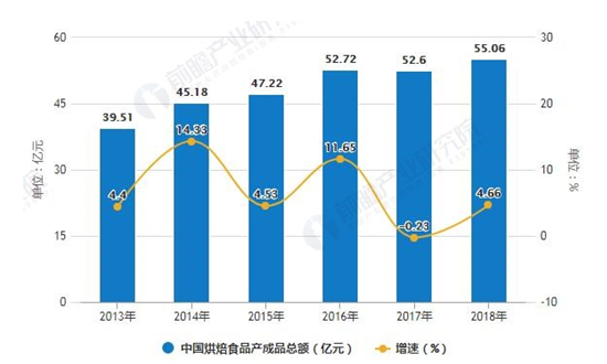 2013-2018年中國(guó)烘焙食品產(chǎn)成品總額統(tǒng)計(jì)及增長(zhǎng)情況