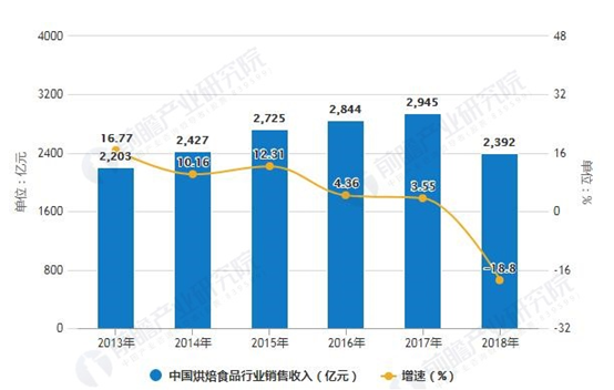 2013-2018年中國(guó)烘焙食品行業(yè)銷售收入統(tǒng)計(jì)及增長(zhǎng)情況