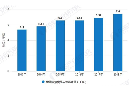隨著飲食習(xí)慣的改變,我國(guó)烘焙食品年人均烘焙產(chǎn)品消費(fèi)量逐年上升。據(jù)中國(guó)食品工業(yè)協(xié)會(huì)烘焙專業(yè)委員會(huì)統(tǒng)計(jì)數(shù)據(jù)顯示,2018年,我國(guó)烘焙食品人均消費(fèi)量約7.4千克。