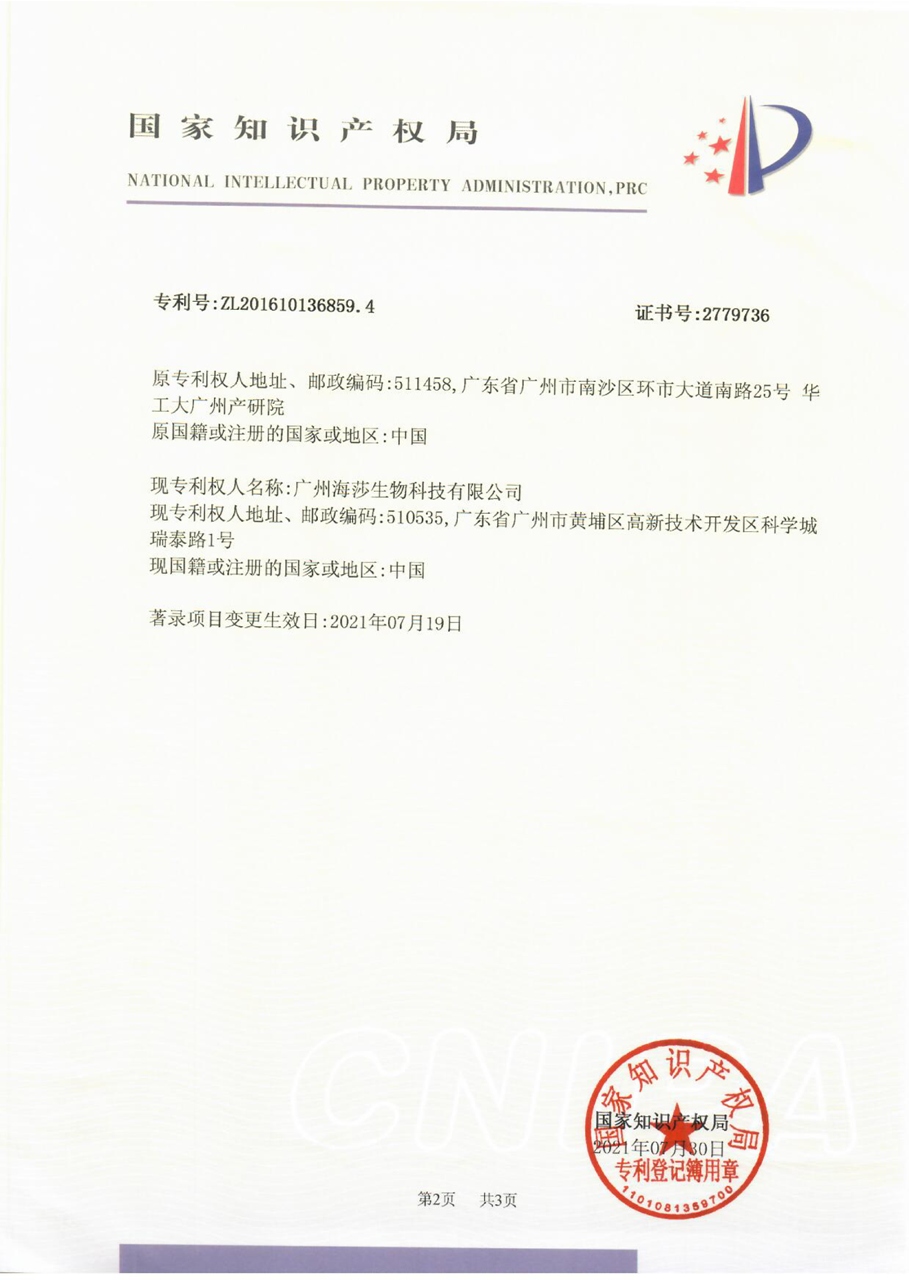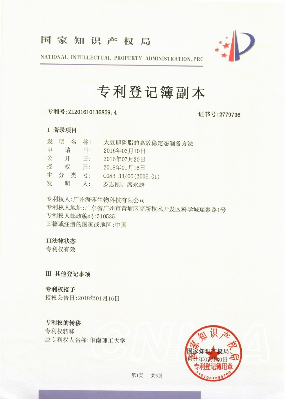 廣州海莎生物科技有限公司獲磷脂生產(chǎn)新專利,為開發(fā)高質量磷脂 產(chǎn)品提供了保障。